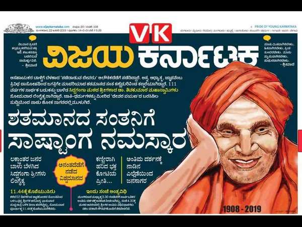 ವಿಜಯ ಕರ್ನಾಟಕವು 'ಶತಮಾನದ ಸಂತನಿಗೆ ಸಾಷ್ಟಾಂಗ ನಮಸ್ಕಾರ' ಎಂಬ ತಲೆಬರಹದೊಂದಿಗೆ ಶ್ರೀಗಳಿಗೆ ನಮಿಸಿದೆ. ಅಂದವಾದ ವಿನ್ಯಾಸ ಗಮನ ಸೆಳೆಯುತ್ತಿದೆ. ನಾಲ್ಕು ವಿಶೇಷ ಪುಟಗಳನ್ನು ಶ್ರೀಗಳಿಗೆ ಮೀಸಲಿಟ್ಟಿದೆ. ಹಳೆಯ ಚಿತ್ರಗಳ ಜೊತೆಗೆ ವಿಶೇಷ ವರದಿಗಳನ್ನು ವಿಕೆ ಪ್ರಕಟಿಸಿದೆ.