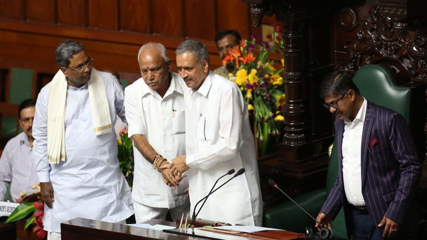 ಕಾಂಗ್ರೆಸ್ ಮತ್ತು ಜೆಡಿಎಸ್ನಿಂದ ಯಾವ ಅಭ್ಯರ್ಥಿಗಳೂ ಸ್ಪೀಕರ್ ಸ್ಥಾನಕ್ಕೆ ನಾಮಪತ್ರವನ್ನು ಸಲ್ಲಿಸದ ಕಾರಣ ವಿಶ್ವೇಶ್ವರ ಹೆಗಡೆ ಕಾಗೇರಿ ಅವಿರೋಧವಾಗಿ ವಿಧಾನ ಸಭಾಧ್ಯಕ್ಷರಾಗಿ ಆಯ್ಕೆಗೊಂಡರು. ನೂತನ ಸಭಾಧ್ಯಕ್ಷರನ್ನು ಪೀಠಕ್ಕೆ ಯಡಿಯೂರಪ್ಪ ಮತ್ತು ಪ್ರತಿಪಕ್ಷ ನಾಯಕ ಸಿದ್ದರಾಮಯ್ಯ ಕರೆತಂದರು.