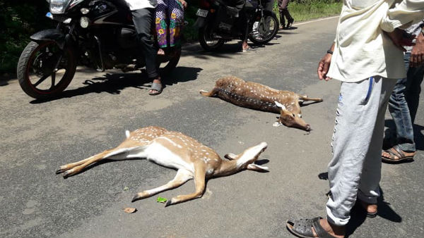 ನಾಯಿಯೊಂದು ಅಟ್ಟಾಡಿಸಿಕೊಂಡು ಬಂದಿದ್ದರಿಂದ ಅದರಿಂದ ತಪ್ಪಿಸಿಕೊಳ್ಳಲು ಎರಡು ಜಿಂಕೆಗಳು ಓಡಿ ಬರುತ್ತಿದ್ದವು. ಅದರಲ್ಲಿ ಒಂದು ಜಿಂಕೆ, ದಾಂಡೇಲಿಯ ಅಂಬೇವಾಡಿ ರೈಲ್ವೆ ಗೇಟಿನ ಬಳಿ ಸಾಗುತ್ತಿದ್ದ ಕಾರಿಗೆ ಡಿಕ್ಕಿಯಾಗಿದೆ. ಅಪಘಾತದಿಂದ ರಸ್ತೆಯ ಮೇಲೆ ಬಿದ್ದಿದ್ದ ಜಿಂಕೆ ಸತ್ತಿರುವುದನ್ನು ಕಂಡು ಇನ್ನೊಂದು ಜಿಂಕೆಗೂ ಹೃದಯಾಘಾತವಾಗಿದೆ. ಹೀಗಾಗಿ ಎರಡೂ ಜಿಂಕೆಗಳು ರಸ್ತೆಯಲ್ಲೇ ಮೃತಪಟ್ಟಿವೆ.