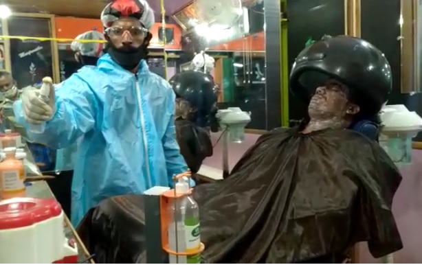 ಕೋಲಾರದ ಸಲೂನ್ ನಲ್ಲಿ ಪಿಪಿಇ ಕಿಟ್ ಧರಿಸಿ ಕ್ಷೌರ