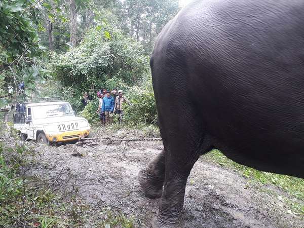 ಹಗ್ಗ ಕಟ್ಟಿ ಎಳೆದರೂ ಪ್ರಯೋಜನವಾಗಲಿಲ್ಲ. ಬಳಿಕ ಸಮೀಪದ ಮತ್ತಿಗೋಡು ಆನೆ ಶಿಬಿರದಿಂದ ಸಾಕಾನೆಗಳನ್ನು ಕರೆಯಿಸಿ ಸಿಲುಕಿಕೊಂಡ ವಾಹನವನ್ನು ಮೇಲೆತ್ತುವ ತೀರ್ಮಾನ ಮಾಡಲಾಯಿತು. ಅರಣ್ಯಾಧಿಕಾರಿಗಳ ನೆರವಿನಿಂದ ಮತ್ತಿಗೋಡು ಶಿಬಿರದ ಗೋಪಾಲಸ್ವಾಮಿ ಸಾಕಾನೆ ಬಂತಾದರೂ ಅದು ಪಿಕಪ್ ಅನ್ನು ಕೆಸರಿನಿಂದ ಮೇಲೆತ್ತಲೂ ಮುಂದಾಗಲಿಲ್ಲ.