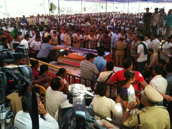 ಮೂರು ಸುತ್ತು ಕುಶಾಲ ತೋಪುಗಳನ್ನು ಹಾರಿಸುವ ಮೂಲಕ ಸಕಲ ಸರ್ಕಾರಿ ಗೌರವ ಸಲ್ಲಿಸಲಾಯಿತು. ವಿವಿಧ ಜಿಲ್ಲೆಗಳಿಂದ ಆಗಮಿಸಿದ ರೈತರು ಒಂದು ಹಿಡಿ ಮಣ್ಣನ್ನು ಹಾಕಿದರು.
