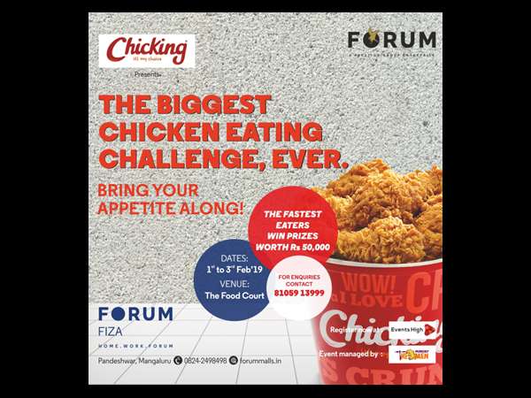 ಹೌದು, ನಗರದ ಪಾಂಡೇಶ್ವರದಲ್ಲಿರುವ ಫೋರಂ ಫಿಜ್ಜಾ ಮಾಲ್ ನಲ್ಲಿ 3 ದಿನಗಳಕಾಲ ಚಿಕನ್ ತಿನ್ನುವ ಸ್ಪರ್ಧೆ ಆಯೋಜಿಸಲಾಗಿದೆ. ಫೆಬ್ರವರಿ 1ರಿಂದ 3 ರವರೆಗೆ ಈ ಚಿಕನ್ ತಿನ್ನುವ ಸ್ಪರ್ಧೆ ಆಯೋಜಿಸಲಾಗಿದೆ.