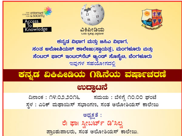 ಹದಿಮೂರನೇ ವಾರ್ಷಿಕೋತ್ಸವ ಆಚರಣೆಯು ಮಂಗಳೂರಿನ ಸಂತ ಅಲೋಷಿಯಸ್ ಕಾಲೇಜಿನ ಕನ್ನಡ ವಿಭಾಗದ ನೇತೃತ್ವದಲ್ಲಿ, ವಿಕಿಮೀಡಿಯಾ ಫೌಂಡೇಷನ್ ಹಾಗೂ ಸೆಂಟರ್ ಫಾರ್ ಇಂಟರ್ನೆಟ್ ಸೊಸೈಟಿಯ ಸಹಯೋಗದೊಂದಿದೆ ನಡೆಯಲಿದ್ದು ಆ ದಿನ ಸಭಾ ಕಾರ್ಯಕ್ರಮ, ಸಂಪಾದನೋತ್ಸವ, ಪೋಟೋನಡಿಗೆ, ಪ್ರಾತ್ಯಕ್ಷಿಕೆ ಮುಂತಾದ ಕಾರ್ಯಕ್ರಮಗಳು ಆಯೋಜಿಸಲ್ಪಟ್ಟಿವೆ. ವಿಕಿಸಮುದಾಯದ ಎಲ್ಲರಿಗೂ ಪಾಲ್ಗೊಳ್ಳಲು ಆಹ್ವಾನವಿದೆ.