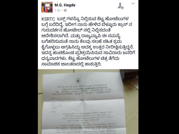 ಕೆಎಸ್ಆರ್ಟಿಸಿ ಹೋಟೆಲ್ ಗಳಲ್ಲಿ ಶೋಷಣೆ, ಫೇಸ್ಬುಕ್ ಪೋಸ್ಟ್ ವೈರಲ್