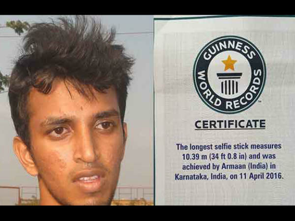 ಮಣಿಪಾಲದ ಎಂಐಟಿಯಲ್ಲಿ ಎಲೆಕ್ಟ್ರಿಕಲ್ ಆಂಡ್ ಎಲೆಕ್ಟ್ರಾನಿಕ್ಸ್ ಇಂಜಿನಿಯರಿಂಗ್ ಓದುತ್ತಿರುವ ಅರ್ಮಾನ್ ವಿಶ್ವದ ಅತಿ ದೊಡ್ಡ ಸೆಲ್ಫಿ ಸ್ಟಿಕ್ ತಯಾರಿಸಿದ್ದರು. ಅರ್ಮಾನ್ 10.39ಮೀಟರ್ ಉದ್ದ ಸೆಲ್ಫಿ ಸ್ಟಿಕ್ ತಯಾರಿಸಿದ್ದರು. ಈ ಮೂಲಕ ಅಮೆರಿಕಾದ ಹಾಲಿವುಡ್ ನಟ ಬೆನ್ ಸ್ಟಿಲ್ಲರ್ (8.56 ಮೀಟರ್ ಉದ್ದದ ಸೆಲ್ಫಿಸ್ಟಿಕ್) ಹೆಸರಿನಲ್ಲಿದ್ದ ಈ ಹಿಂದಿನ ದಾಖಲೆಯನ್ನು ಮುರಿದಿದ್ದಾರೆ. [ವಿಶ್ವದ ಅತಿ ದೊಡ್ಡ ಸೆಲ್ಫಿ ಸ್ಟಿಕ್ ಮಣಿಪಾಲದಲ್ಲಿದೆ]