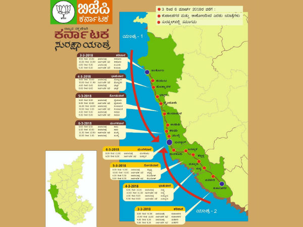 ಕೊಡಗಿನ ಕುಶಾಲನಗರದಿಂದ ಸಂಸದ ಪ್ರತಾಪ್ ಸಿಂಹ, ಚಿಕ್ಕಮಗಳೂರಿನಿಂದ ಸಂಸದೆ ಶೋಭಾ ಕರಂದ್ಲಾಜೆ, ಉತ್ತರ ಕನ್ನಡ ಜಿಲ್ಲೆಯ ಕುಮಟಾದಿಂದ ಸಂಸದ ಅನಂತ್ ಕುಮಾರ್ ಹೆಗಡೆ ಹಾಗೂ ದಕ್ಷಿಣ ಕನ್ನಡ ಜಿಲ್ಲೆಯಿಂದ ಸಂಸದ ನಳಿನ್ ಕುಮಾರ್ ಕಟೀಲ್ ಏಕಕಾಲಕ್ಕೆ ಮಾರ್ಚ್ 3 ರಂದು ಪಾದಯಾತ್ರೆ ಆರಂಭಿಸಲಿದ್ದಾರೆ. ಈ ಪಾದಯಾತ್ರೆ ಮಾರ್ಚ್ 6 ರಂದು ಮಂಗಳೂರಿನ ಸುರತ್ಕಲ್ ನಲ್ಲಿ ಸಂಪನ್ನಗೊಳ್ಳಲಿದೆ. ಈ ಪಾದಯಾತ್ರೆಯ ಸಮಾರೋಪದ ಭಾಗವಾಗಿ ಬೃಹತ್ ಸಮಾವೇಶ ಹಮ್ಮಿಕೊಳ್ಳಲು ಕಮಲ ಮುಖಂಡರು ಮುಂದಾಗಿದ್ದಾರೆ.