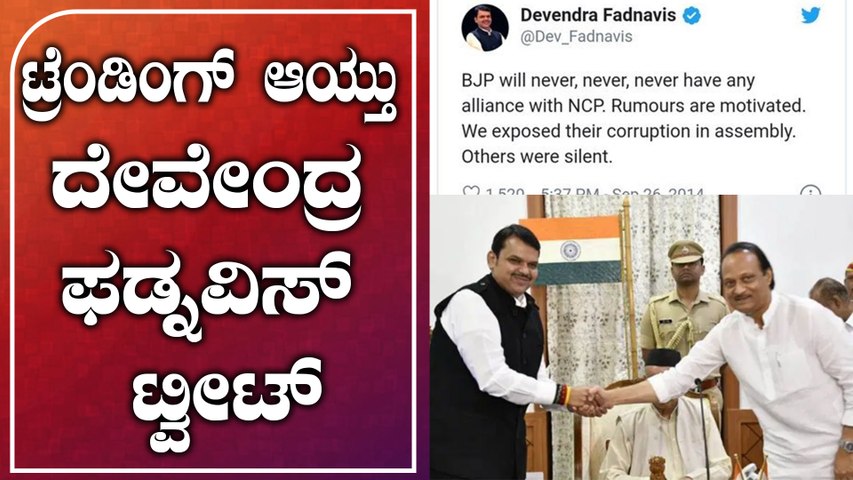 ಇದೀಗ ಬಿಜೆಪಿ ಎನ್ ಸಿಪಿಯ ಅಜಿತ್ ಪವಾರ್ ಅವರ ಬೆಂಬಲದೊಂದಿಗೆ ಸರ್ಕಾರ ರಚನೆ ಮಾಡಲು ಮುಂದಾಗಿದ್ದು, ಈಗಾಗಲೇ ಪ್ರಮಾಣ ವಚನ ಸ್ವೀಕರಿಸಿದ್ದಾರೆ. ಆದರೆ ಈ ಕ್ಷಿಪ್ರ ಬೆಳವಣಿಗೆಯ ಹೊತ್ತಲ್ಲಿ ಮುಖ್ಯಮಂತ್ರಿ ದೇವೇಂದ್ರ ಫಡ್ನವಿಸ್ ಅವರು 2014 ರ ಸೆಪ್ಟೆಂಬರ್ 26 ರಂದು ಮಾಡಿದ್ದ ಟ್ವೀಟ್ ಇದೀಗ ಟ್ರೆಂಡಿಂಗ್ ಆಗಿದೆ.