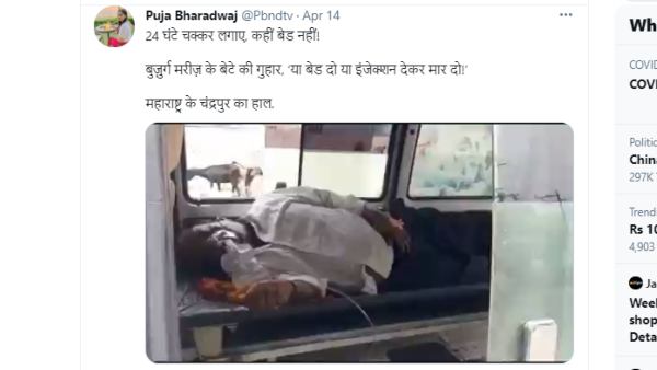 ಅಂಬ್ಯುಲೆನ್ಸ್ನಲ್ಲಿ ತಂದೆಯನ್ನು ಆಸ್ಪತ್ರೆಗೆ ಕರೆದುಕೊಂಡು ಬಂದಿರುವ ಮಗ, "ಆಸ್ಪತ್ರೆಯಲ್ಲಿ ನಿಮಗೆ ಹಾಸಿಗೆಗಳನ್ನು ಒದಗಿಸಲು ಸಾಧ್ಯವಾಗದಿದ್ದರೆ, ಕನಿಷ್ಠ ಇಂಜೆಕ್ಷನ್ ಕೊಟ್ಟು ಕೊಂದು ಬಿಡಿ' ಎಂದು ಮಹಾರಾಷ್ಟ್ರದಲ್ಲಿ ಕೊರೊನಾ ಸೋಂಕಿತನ ಮಗನೊಬ್ಬ ತನ್ನ ಅಳಲು ತೋಡಿಕೊಂಡಿದ್ದಾನೆ. ಈ ವಿಡಿಯೋ ಸಾಮಾಜಿಕ ಜಾಲತಾಣದಲ್ಲಿ ಈಗ ವೈರಲ್ ಆಗುತ್ತಿದೆ.