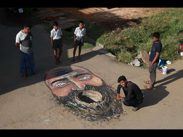 ನಗರದ ಬಿಗ್ ಬಜಾರ್ ಬಳಿ ಹಾಡ್ರ್ವಿಕ್ ಶಾಲೆಯ ಕ್ಯಾಂಟೀನ್ ಎದುರಿನ ಒಳ ಚರಂಡಿಯ ಮ್ಯಾನ್ ಹೋಲ್ ಮುಚ್ಚಳವಿಲ್ಲದೇ ಬಾಯಿ ತೆರೆದುಕೊಂಡು ಅಪಾಯಕ್ಕೆ ಆಹ್ವಾನ ನೀಡುವಂತಿತ್ತು. ಅಲ್ಲಿ ಚಿತ್ರ ರಚಿಸಿ ಜನಪ್ರನಿಧಿಗಳ, ಪಾಲಿಕೆ ಅಧಿಕಾರಿಗಳ ನಿರ್ಲಕ್ಷ್ಯವನ್ನು ಅಣಕಿಸುವ ಪ್ರಯತ್ನ ಮಾಡಿದ್ದಾರೆ.