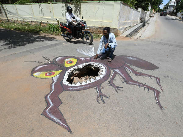 ನಗರದ ಪ್ರತಿಷ್ಠಿತ ಯಾದವಗಿರಿ ರಸ್ತೆಯ ಮಧ್ಯೆ ಕಳೆದ 2 ತಿಂಗಳಿನಿಂದ ಆಳವಾದ ಗುಂಡಿ ಬಿದ್ದಿದೆ. ಈ ಬಗ್ಗೆ ಅಲ್ಲಿನ ನಾಗರೀಕರು ಪಾಲಿಕೆಯ ಗಮನಕ್ಕೆ ತಂದರೂ ಏನೂ ಪ್ರಯೋಜನವಾಗಿರಲಿಲ್ಲ. ಸ್ಥಳೀಯ ನಿವಾಸಿಗಳು ಕಲಾವಿದ ಬಾದಲ್ ನಂಜುಂಡಸ್ವಾಮಿಗೆ ತಿಳಿಸಿದ್ದರು. ಕಲಾವಿದ ನಂಜುಂಡಸ್ವಾಮಿ ಸ್ಥಳಕ್ಕೆ ಹೋಗಿ ಪಾಲಿಕೆಯನ್ನು ಎಚ್ಚರಿಸಲು ಹಾಗೂ ಡೆಂಗ್ಯೂವಿನ ಬಗ್ಗೆ ಎಚ್ಚರಿಕೆ ನೀಡಲು ಡೆಂಗ್ಯೂ ಸೊಳ್ಳೆಯ ಚಿತ್ರ ಬರೆದು ಜಾಗೃತಿ ಮೂಡಿಸಿದ್ದಾರೆ.