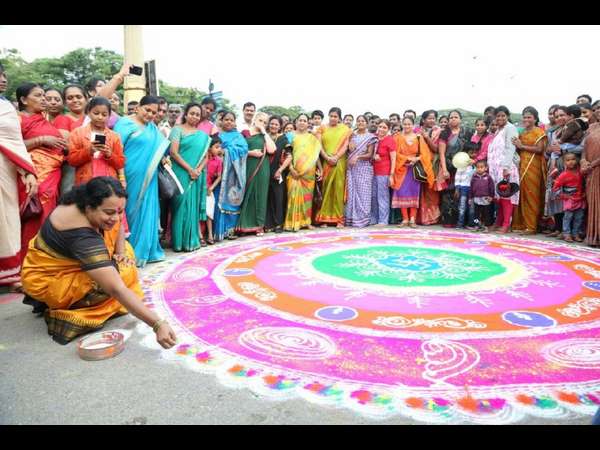 ಚಿತ್ತಾರದ ರಂಗೋಲಿಯೊಂದಿಗೆ ಮಹಿಳಾ ದಸರೆಗೆ ಉಮಾಶ್ರೀ ಚಾಲನೆ