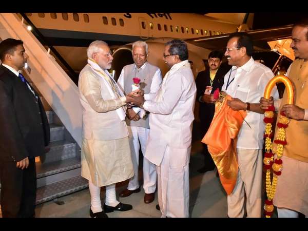ಮೈಸೂರಿನ ಮಂಡಕಳ್ಳಿ ವಿಮಾನ ನಿಲ್ದಾಣಕ್ಕೆ ಭಾನುವಾರ ರಾತ್ರಿ ಆಗಮಿಸಿದ ಪ್ರಧಾನಿ ನರೇಂದ್ರ ಮೋದಿಯರನ್ನು ಮುಖ್ಯಮಂತ್ರಿ ಸಿದ್ದರಾಮಯ್ಯ ಶಾಲು ಹಾಕಿ, ಹೂ ನೀಡಿ ಸ್ವಾಗತಿಸಿದರು.