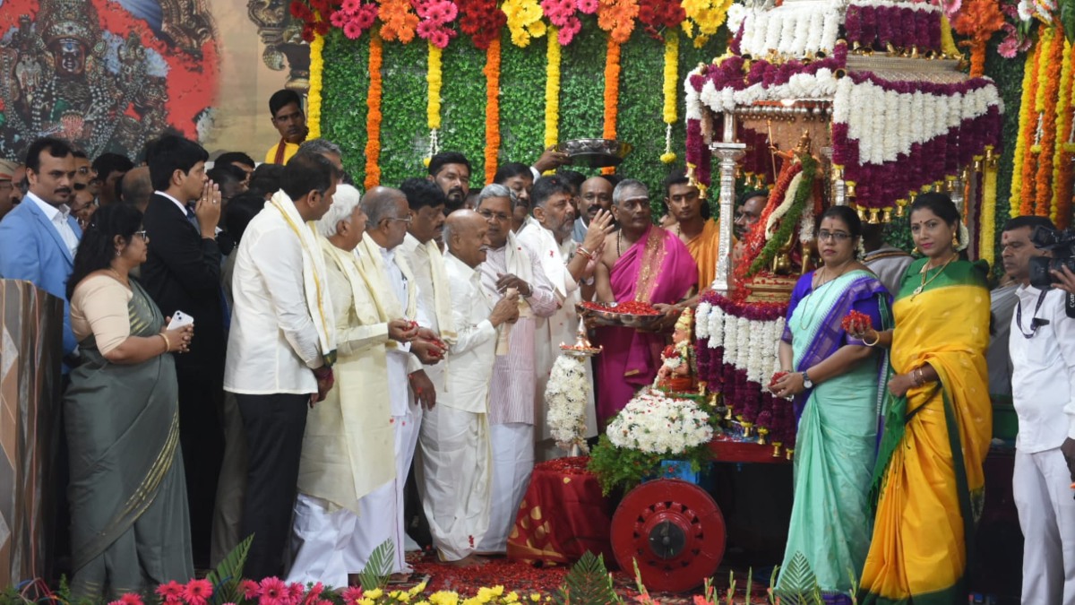 ನಾಡ ಹಬ್ಬ ಪ್ರಯುಕ್ತ ಮೈಸೂರಿನಲ್ಲಿ ತಾಯಿ ಚಾಮುಂಡೇಶ್ವರಿಗೆ ಗುರುವಾರ ಬೆಳಗ್ಗೆ 9.31ಕ್ಕೆ ಸಲ್ಲುವ ಶುಭ ವೃಶ್ಚಿಕ ಲಗ್ನದಲ್ಲಿ ಸಾಹಿತಿ ಹಂಪ ನಾಗರಾಜಯ್ಯ ಅವರೊಂದಿಗೆ ಗಣ್ಯರಾದ ಮುಖ್ಯಮಂತ್ರಿ ಸಿದ್ದರಾಮಯ್ಯ, ಡಿಸಿಎಂ ಡಿ.ಕೆ.ಶಿವಕುಮಾರ್, ಜಿಲ್ಲಾ ಉಸ್ತುವಾರಿ ಸಚಿವ ಡಾ.ಎಚ್ .ಸಿ.ಮಹದೇವಪ್ಪ ಅಗ್ರಪೂಜೆ ಸಲ್ಲಿಸಿದರು. ಚಾಮುಂಡೇಶ್ವರಿಗೆ ಪುಷ್ಪಾರ್ಚನೆ ನೆರವೇರಿಸಿದರು.