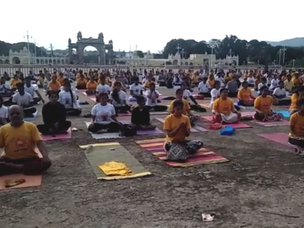 ಮೈಸೂರು ಜಿಲ್ಲಾಡಳಿತ ಮತ್ತು ವಿವಿಧ ಯೋಗ ಸಂಸ್ಥೆಗಳ ಸಹಯೋಗದಲ್ಲಿ ಇಂದು ಭಾನುವಾರ ಮುಂಜಾನೆ 6 ಗಂಟೆಯಿಂದಲೇ ಮೈಸೂರಿನ ಅರಮನೆ ಮುಂಭಾಗದ ಆವರಣದಲ್ಲಿ ಯೋಗಪಟುಗಳು ಯೋಗಾಭ್ಯಾಸದಲ್ಲಿ ತಲ್ಲೀನರಾಗಿದ್ದಾರೆ.