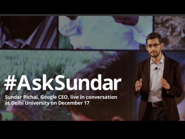 ನವದೆಹಲಿ, ಡಿ. 17: ಗೂಗಲ್ ಸಂಸ್ಥೆ ಸಿಇಒ ಸುಂದರ್ ಪಿಚೈ ಅವರು ಗುರುವಾರದಂದು ದೆಹಲಿ ವಿಶ್ವವಿದ್ಯಾಲಯ ಶ್ರೀರಾಮ ಕಾಲೇಜ್ ಆಫ್ ಕಾಮರ್ಸ್ ನ 2000ಕ್ಕೂ ಅಧಿಕ ವಿದ್ಯಾರ್ಥಿಗಳ ಜೊತೆ ನಡೆಸಿದ ಸಂವಾದ ರಸಮಯವಾಗಿತ್ತು. ಇದಕ್ಕಿಂತಲೂ ಸ್ವಾರಸ್ಯಕರವಾಗಿ ಟ್ವಿಟ್ಟರ್ ನಲ್ಲಿ #asksundar ಎಂಬ ಟ್ಯಾಗ್ ನೊಂದಿಗೆ ಬಂದ ಪ್ರಶ್ನೆಗಳು ಹುಬ್ಬೇರಿಸುವಂತೆ ಇತ್ತು.