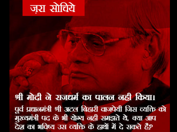 'ಶ್ರೀಮೋದಿ ನೀವು ರಾಜಧರ್ಮ ಪಾಲಿಸಿಲ್ಲ. ಮೋದಿ ಅವರನ್ನು ಮುಖ್ಯಮಂತ್ರಿಯಾಗಿ ವಾಜಪೇಯಿ ಅವರು ಪರಿಗಣಿಸಿರಲಿಲ್ಲ, ನಿಮ್ಮ ಕೈಯಲ್ಲಿ ಹೇಗೆ ದೇಶದ ಭವಿಷ್ಯ ಸುರಕ್ಷಿತವಾಗಿರಲು ಸಾಧ್ಯ' ಎಂಬ ಅರ್ಥ ಬರುವ ಹೇಳಿಕೆ ಚಿತ್ರದಲ್ಲಿದೆ.