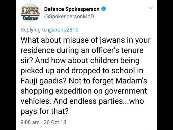 ಇದಕ್ಕೆ ರಕ್ಷಣಾ ಸಚಿವಾಲಯದ ಅಧಿಕೃತ ಖಾತೆ ಬಳಸಿ ಪ್ರತಿಕ್ರಿಯೆ ನೀಡಿದ್ದ ವಕ್ತಾರ, 'ನಿಮ್ಮ ಅಧಿಕಾರದ ಅವಧಿಯಲ್ಲಿ ಮನೆಯಲ್ಲಿ ಸೈನಿಕರನ್ನು ದುರ್ಬಳಕೆ ಮಾಡಿಕೊಳ್ಳುವುದರ ಬಗ್ಗೆ ಏನು ಸರ್? ಮಕ್ಕಳನ್ನು ಸೇನೆಯ ವಾಹನದಲ್ಲಿ ಶಾಲೆಗೆ ಕರೆದೊಯ್ಯುವ ಮತ್ತು ಮರಳಿ ತರುವ ಬಗ್ಗೆ ಏನು? ಸರ್ಕಾರಿ ವಾಹನಗಳಲ್ಲಿ ಮೇಡಂ (ಅಧಿಕಾರಿಯ ಪತ್ನಿ) ಅವರ ಶಾಪಿಂಗ್ ವೆಚ್ಚವಾಗುವುದನ್ನು ಮರೆಯುವಂತಿಲ್ಲ. ಮತ್ತು ಲೆಕ್ಕವಿಲ್ಲದಷ್ಟು ಪಾರ್ಟಿಗಳು... ಅವುಗಳಿಗೆ ಯಾರು ಹಣ ನೀಡುತ್ತಾರೆ?' ಎಂದು ಬರೆದಿದ್ದರು.