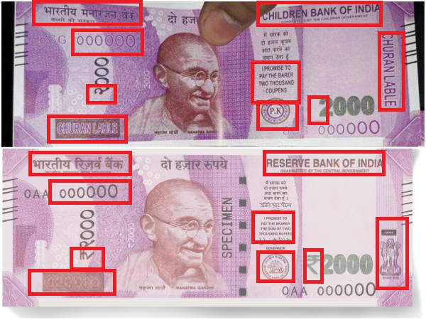 ನೋಟಿನಲ್ಲಿ ರಿಸರ್ಬ್ ಬ್ಯಾಂಕಿನ ಮುದ್ರೆಯ ಜಾಗದಲ್ಲಿ ಪಿ. ಕೆ (PK) ಮುದ್ರೆ ಇದೆ. ಇನ್ನೊಂದು ಭಾಗದಲ್ಲಿ ಅಶೋಕ ಸ್ಥಂಭ ಇರಬೇಕಾದ ಜಾಗದಲ್ಲಿ 'ಚರುನ್ ಲೇಬಲ್' ಎಂದು ಬರೆಯಲಾಗಿದೆ. ಅದೇ ರೀತಿ ಭದ್ರತಾ ವೈಶಿಷ್ಠ್ಯ ಇರುವ 2000 ರೂಪಾಯಿ ಬರೆದ ಜಾಗದಲ್ಲಿಯೂ 'ಚರುನ್ ಲೇಬಲ್' ಎಂದು ಬರೆಯಲಾಗಿದೆ.