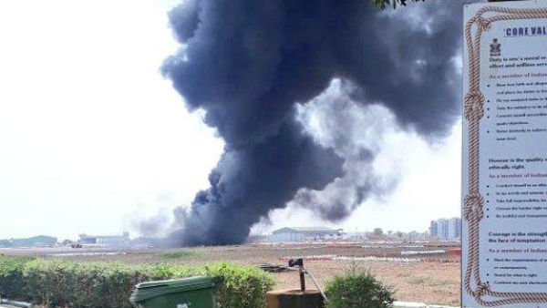 Spokesperson Navy: Goa Airport closed temporarily for a few hours in view of fire caused by a drop tank of MiG 29K which got detached whilst taking off. All efforts in hand to resume flights as soon as possible. MiG 29K fighter aircraft is safe. (Pic courtesy: Spokesperson Navy) pic.twitter.com/dpPbMhBodV
