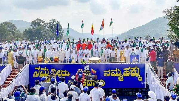 ಭಾನುವಾರ ಬೆಳಗ್ಗೆ ಮೇಕೆದಾಟು ಸಂಗಮದಲ್ಲಿ ಹಿಂದೂ, ಕ್ರೈಸ್ತ ಧರ್ಮಗುರುಗಳು ಕುಂಡಗಳಲ್ಲಿದ್ದ ಸಸಿಗಳಿಗೆ ನೀರೆರೆಯುವ ಮೂಲಕ ಮೇಕೆದಾಟು ಪಾದಯಾತ್ರೆಗೆ ಚಾಲನೆ ನೀಡಿದರು. ರಾಜ್ಯಸಭೆ ವಿಪಕ್ಷ ನಾಯಕ ಮಲ್ಲಿಕಾರ್ಜುನ ಖರ್ಗೆ, ವಿರೋಧ ಪಕ್ಷದ ನಾಯಕ ಸಿದ್ದರಾಮಯ್ಯ, ಕೆಪಿಸಿಸಿ ಅಧ್ಯಕ್ಷ ಡಿ. ಕೆ. ಶಿವಕುಮಾರ್ ನಗಾರಿ ಬಾರಿಸುವ ಮೂಲಕ ನೀರಿಗಾಗಿ ಹೋರಾಟಕ್ಕೆ ಬದ್ಧ ಎಂಬ ಸಂದೇಶ ಸಾರಿದರು.