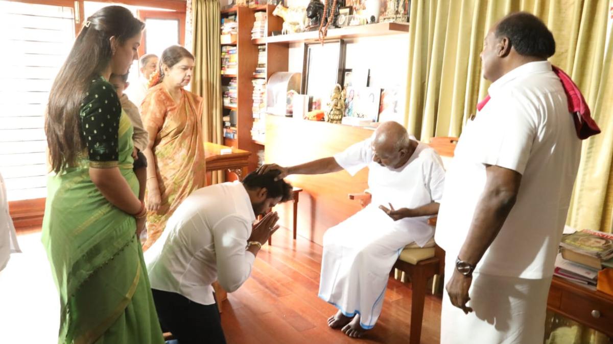 Nikhil Kumaraswamy: ನಾಮಪತ್ರ ಸಲ್ಲಿಸುವ ಮುನ್ನ ದೇವೇಗೌಡ ಮುಂದೆ ಕಣ್ಣೀರಿಟ್ಟ ನಿಖಿಲ್ ಕುಮಾರಸ್ವಾಮಿ