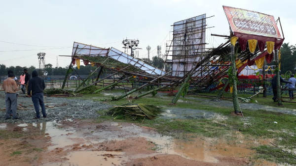 ಶಿವಮೊಗ್ಗ, ಅಕ್ಟೋಬರ್ 26: ಮಳೆಯಿಂದಾಗಿ ನಗರದ ಹಳೇ ಜೈಲಿನ ಬಳಿ ನಿರ್ಮಿಸಲಾಗಿದ್ದ, ದಸರಾ ಉತ್ಸವದ ಬನ್ನಿ ಮಂಟಪ ಕುಸಿದು ಬಿದ್ದಿರುವ ಘಟನೆ ನಡೆದಿದೆ.