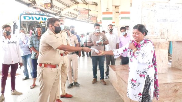 ಖಾಸಗಿ ಬಸ್ ನಿಲ್ದಾಣದಲ್ಲಿ ಹಲವರು ಮಾಸ್ಕ್ ಧರಿಸದೆ ಓಡಾಡುತ್ತಿದ್ದರು. ಇದನ್ನು ಗಮನಿಸಿದ ಹೆಚ್ಚುವರಿ ರಕ್ಷಣಾಧಿಕಾರಿ ಡಾ. ಹೆಚ್. ಟಿ. ಶೇಖರ್, ಡಿವೈಎಸ್ಪಿ ಪ್ರಶಾಂತ್ ಮತ್ತು ಪೊಲೀಸರು, ಪ್ರತಿಯೊಬ್ಬರಿಗೂ ಮಾಸ್ಕ್ ವಿತರಿಸಿದರು.