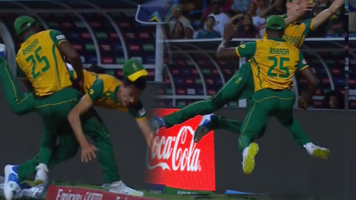 ಎಂಟನೇ ಓವರ್ನ ಐದನೇ ಎಸೆತವನ್ನು ಮಾರ್ಕ್ರಾಮ್ ಮಿಡಲ್ ಮತ್ತು ಲೆಗ್ ಸ್ಟಂಪ್ನಲ್ಲಿ ಬೌಲ್ ಮಾಡಿದರು, ಅದನ್ನು ಮೇಯರ್ಸ್ ಗಾಳಿಯಲ್ಲಿ ಸಿಕ್ಸ್ ಬಾರಿಸಲು ಮುಂದಾದರು. ದಕ್ಷಿಣ ಆಫ್ರಿಕಾದ ಇಬ್ಬರು ವೇಗದ ಬೌಲರ್ಗಳಾದ ಕಗಿಸೊ ರಬಾಡ ಮತ್ತು ಮಾರ್ಕೊ ಜಾನ್ಸೆನ್ ಅವರು ಲಾಂಗ್ ಆನ್ ಮತ್ತು ಲಾಂಗ್ ಆಫ್ನಲ್ಲಿ ಚೆಂಡನ್ನು ಹಿಡಿಯಲು ಸಿದ್ಧರಾಗಿದ್ದರು. ಇಬ್ಬರೂ ಚೆಂಡನ್ನು ಹಿಡಿಯುತ್ತೇವೆ ಎಂದು ಭಾವಿಸಿದ್ದರು, ಆದರೆ ಈ ಪ್ರಕ್ರಿಯೆಯಲ್ಲಿ ಇಬ್ಬರೂ ಡಿಕ್ಕಿ ಹೊಡೆದರು. ಕ್ಯಾಚ್ ಹಿಡಿಯಲು ಥವಾ ಚೆಂಡನ್ನು ತಡೆಯಲು ಸಹ ಈ ಆಟಗಾರರಿಗೆ ಆಗಲಿಲ್ಲ. ಈ ಮಧ್ಯೆ, ರಬಾಡ ಅವರ ಮೊಣಕಾಲು, ಯಾನ್ಸೆನ್ ಅವರ ಹೊಟ್ಟೆಗೆ ತೀವ್ರವಾದ ಗಾಯವನ್ನು ಉಂಟುಮಾಡಿತು.