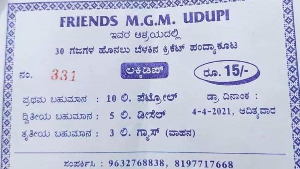 Friends M.G.M. Udupi ಇವರ ಆಶ್ರಯದಲ್ಲಿ ನಡೆಯವ 30 ಗಜಗಳ ಹೊನಲು ಬೆಳಕಿನ ಕ್ರಿಕೆಟ್ ಪಂದ್ಯಾವಳಿ ಇದಾಗಿದೆ. ಇದರ 15 ರೂ. ಲಕ್ಕಿ ಡಿಪ್ ಚಿತ್ರಗಳು ಸಾಮಾಜಿಕ ಜಾಲತಾಣದಲ್ಲಿ ಹರಿದಾಡುತ್ತಿವೆ.
