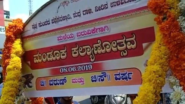 ಉಡುಪಿಯ ಕಿದಿಯೂರ್ ಹೋಟೆಲಿನ ವಾಹನ ನಿಲುಗಡೆ ಪ್ರಾಂಗಣದಲ್ಲಿ ಇಂದು ಹಿಂದೂ ಸಂಪ್ರದಾಯದಂತೆ ಮಂಡೂಕ ಕಲ್ಯಾಣೋತ್ಸವ ನಡೆಯಿತು. ಕಾಲುಂಗುರ ತೊಡಿಸಿ, ಮಾಂಗಲ್ಯ ಕಟ್ಟಿ ಕಪ್ಪೆಗಳ ಮದುವೆಯನ್ನು ವಿಜೃಂಭಣೆಯಿಂದ ನೆರವೇರಿಸುವ ಮೂಲಕ ಮಳೆಗಾಗಿ ಪ್ರಾರ್ಥಿಸಲಾಯಿತು. ಉಡುಪಿ ಜಿಲ್ಲಾ ನಾಗರಿಕ ಸಮಿತಿ ಟ್ರಸ್ಟ್ ಮತ್ತು ಪಂಚರತ್ನಾ ಸೇವಾ ಟ್ರಸ್ಟ್ ಕಪ್ಪೆ ಮದುವೆಯನ್ನು ಆಯೋಜನೆ ಮಾಡಿತ್ತು.