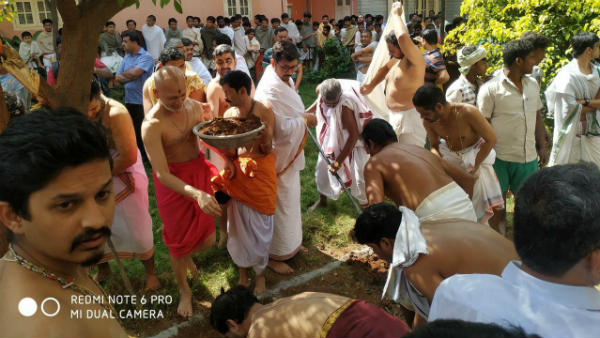 ಬೃಂದಾವನದ ಗುಂಡಿಯೊಳಗೆ ಶ್ರೀಗಳ ಪಾರ್ಥಿವ ಶರೀರ ಕೂರಿಸಿ, ಹತ್ತಿಯನ್ನು ಹಾಕಿ, ಎಳ್ಳು, ಉಪ್ಪು, ಗಿಂಡಿ, ಸಾಲಿಗ್ರಾಮ, ತುಳಸಿಗಳನ್ನು ಗುಂಡಿಯ ಒಳಗೆ ಹಾಕಲಾಗುತ್ತಿದೆ.