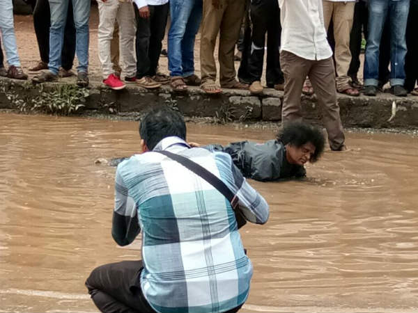 ಈ ವ್ಯಕ್ತಿ ಆಕಸ್ಮಿಕವಾಗಿ ರಸ್ತೆಯ ಹೊಂಡಕ್ಕೆ ಬಿದಿಲ್ಲ. ಇದು ಈಜುಕೊಳವೂ ಅಲ್ಲ. ರಸ್ತೆ ದುರಸ್ಥಿ ಮಾಡಿ ಎಂದು ಒತ್ತಾಯಿಸಲು ವಿಶಿಷ್ಟವಾಗಿ ಪ್ರತಿಭಟನೆ ನಡೆಸಿದ ರೀತಿ ಇದು.