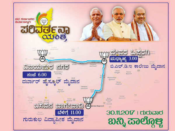 2018 ರ ಕರ್ನಾಟಕ ವಿಧಾನಸಭೆ ಚುನಾವಣೆಯನ್ನು ದೃಷ್ಟಿಯಲ್ಲಿಟ್ಟುಕೊಂಡು ಕರ್ನಾಟಕ ಬಿಜೆಪಿ ಆರಂಭಿಸಿರುವ ನವಕರ್ನಾಟಕ ಪರಿವರ್ತನಾ ಯಾತ್ರೆ ಇಂದು(ನ.30) ವಿಜಯಪುರ ನಗರ, ಬಸವನ ಬಾಗೇವಾಡಿ, ದೇವರ ಹಿಪ್ಪರಿಗೆಯಲ್ಲಿ ಪ್ರಚಾರ ಸಭೆ ನಡೆಸಲಿದೆ.