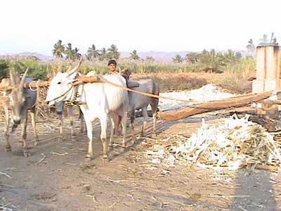 ಗಾಣದಲ್ಲಿ ಕಬ್ಬಿನ ರಸ ತೆಗೆಯುತ್ತಿರುವುದು